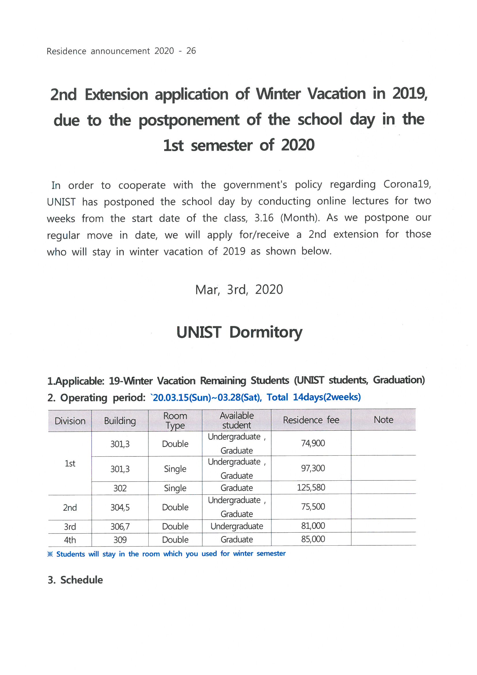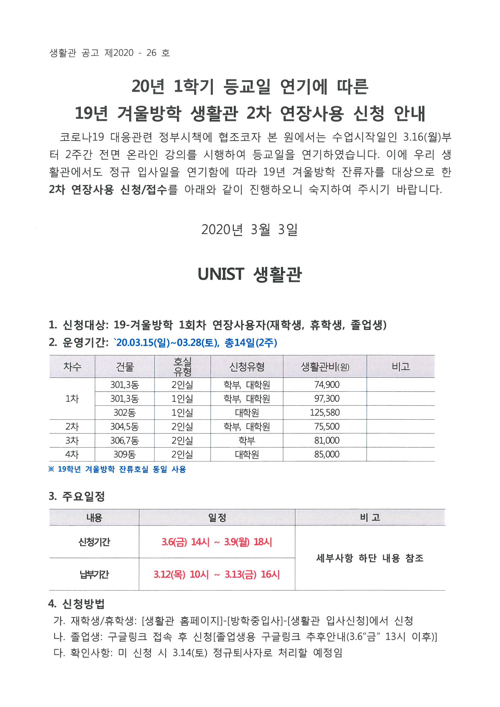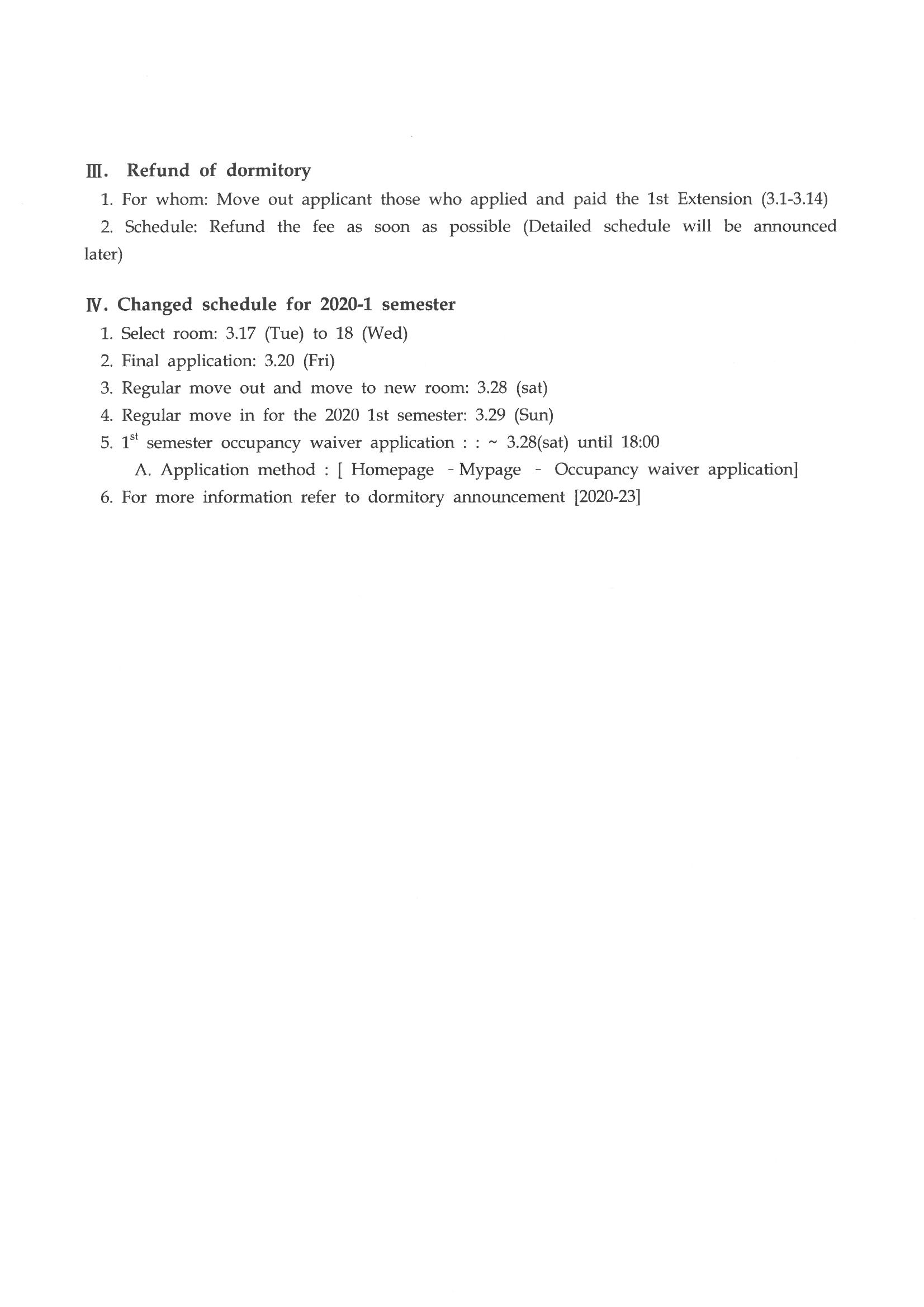 | 310 | 겨울학기 졸업생 생활관 추가 2주 연장 신청안내 2nd extens.. | 2020-03-06 | 4590 | |