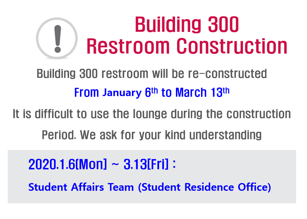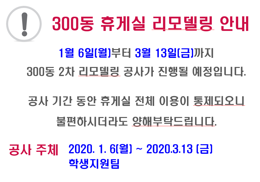 | 267 | 300동 생활관 휴게실 2차 리모델링 안내 | 2020-01-07 | 1576 |