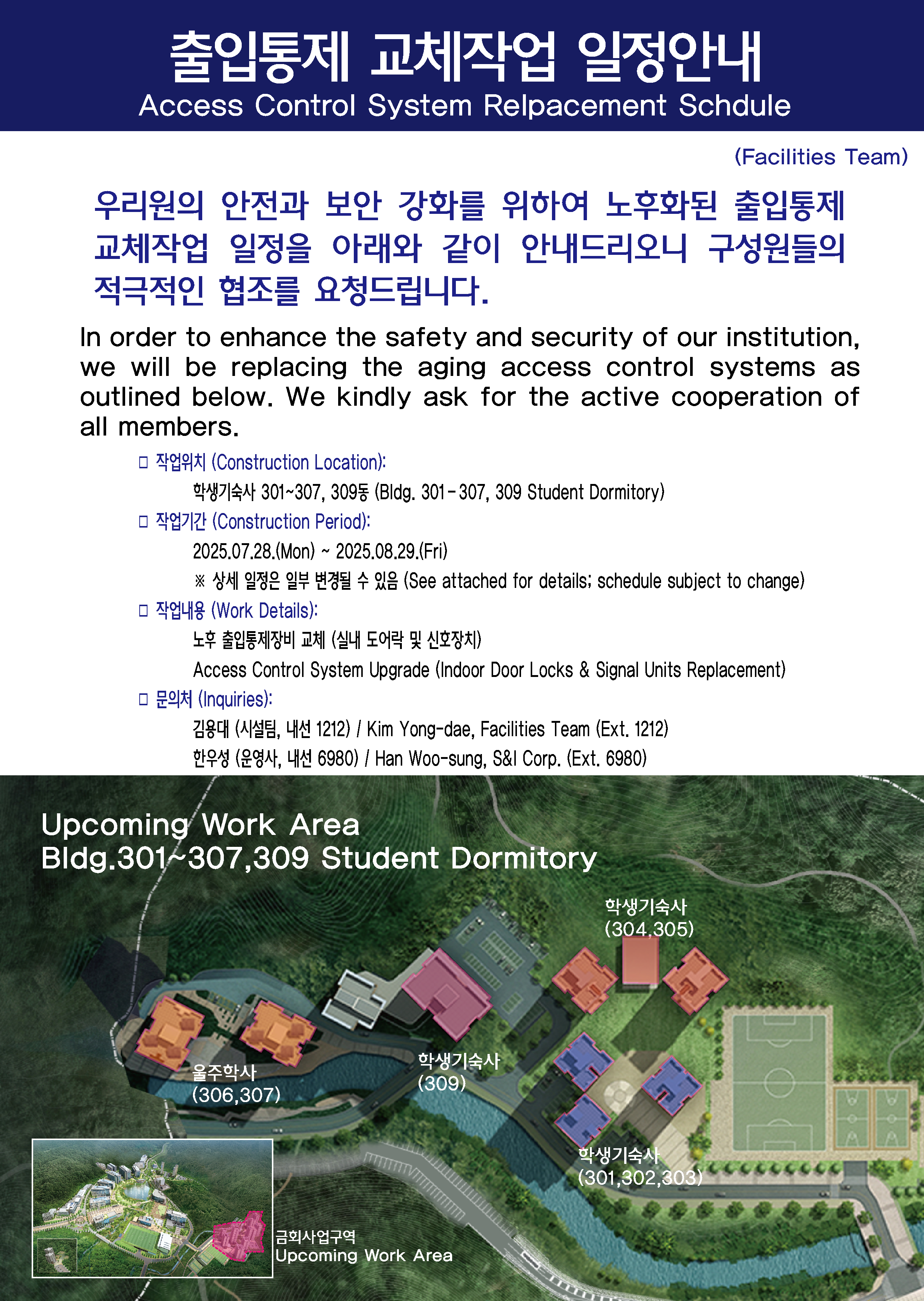 | 1037 | 출입통제 시스템 교체작업 안내/Access Control System Repl.. | 2025-07-25 | 926 |