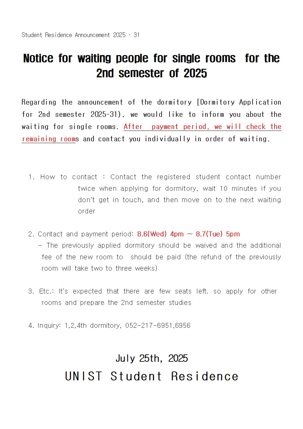 | 1038 | [No.2025-31] 2025학년도 2학기 생활관 1인실 대기자 안내 N.. | 2025-07-25 | 3113 |