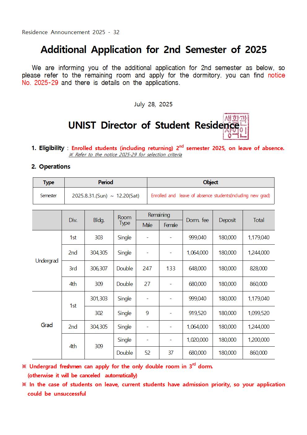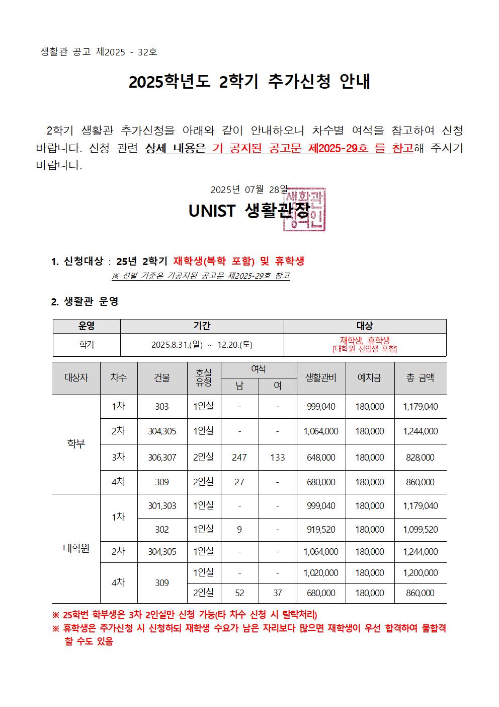 | 1040 | [No.2025-33] 생활관비 납부유예 신청 안내(Notice of appli.. | 2025-07-31 | 1449 |