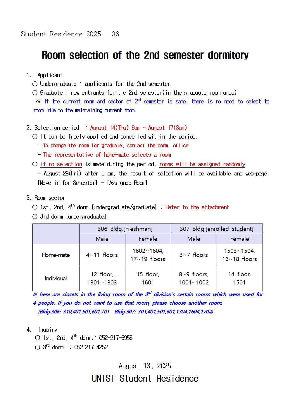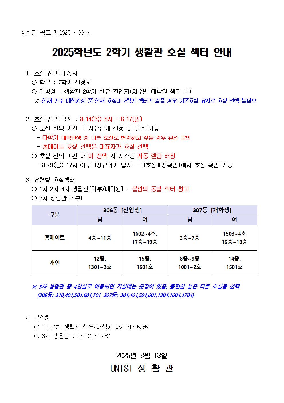 | 1045 | [No.2025-36] 2025학년도 2학기 생활관 호실 섹터 안내(Room.. | 2025-08-13 | 1907 |