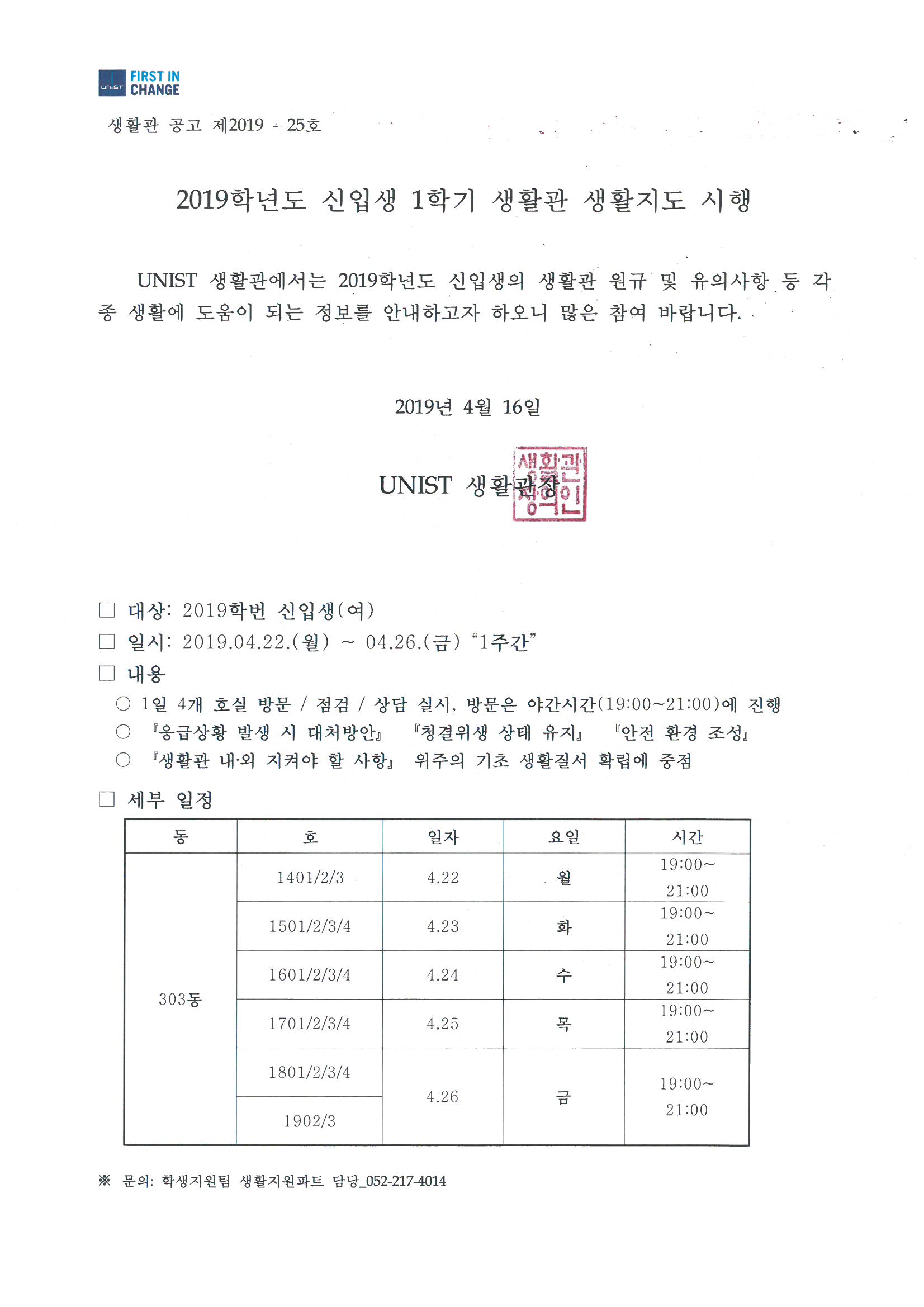 | 156 | (No.2019-25) 2019학년도 신입생 1학기 생활관 생활지도 시.. | 2019-04-17 | 1318 |