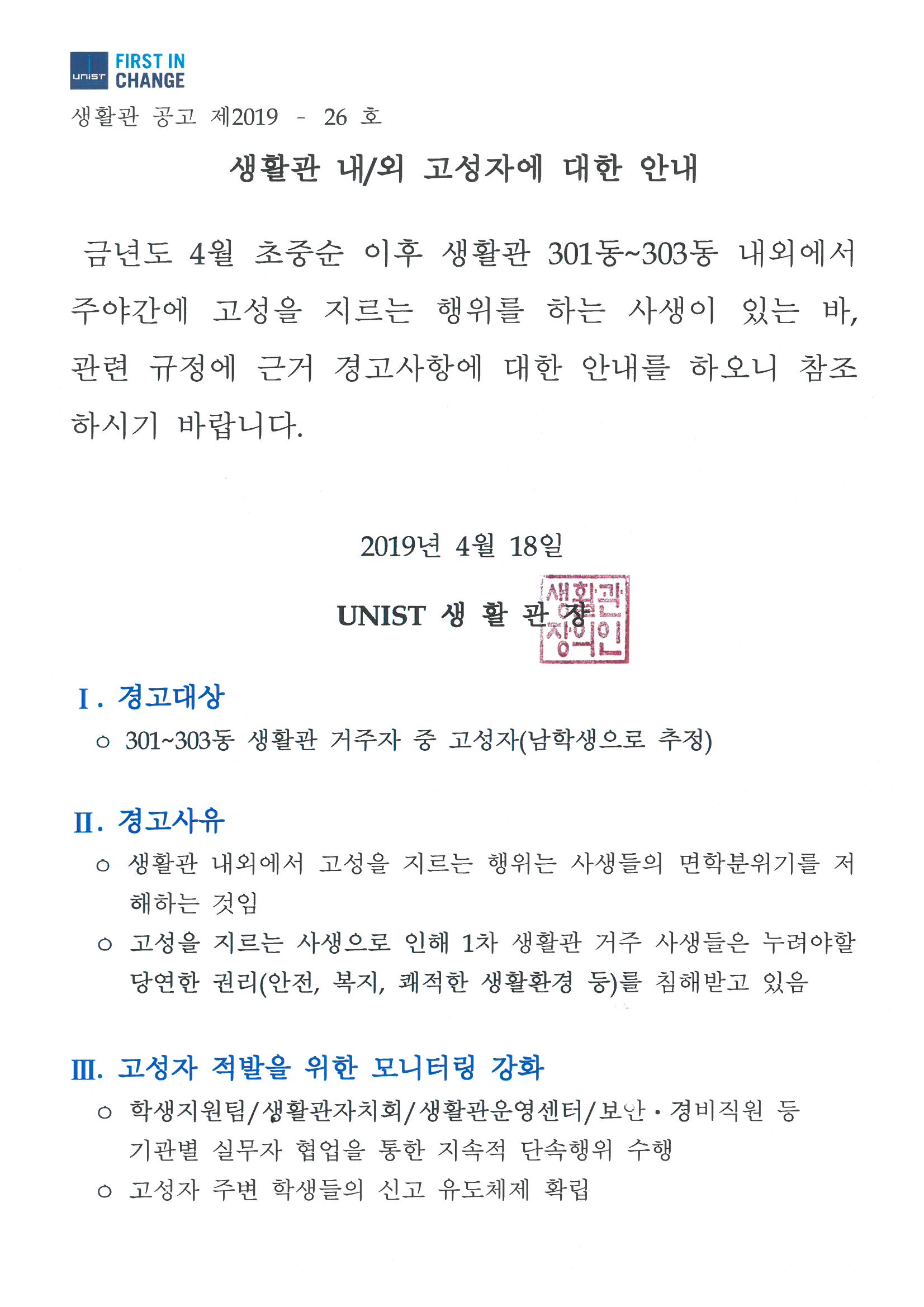 | 157 | (No.2019-26) 생활관 내/외 고성자에 대한 안내 | 2019-04-19 | 1423 |