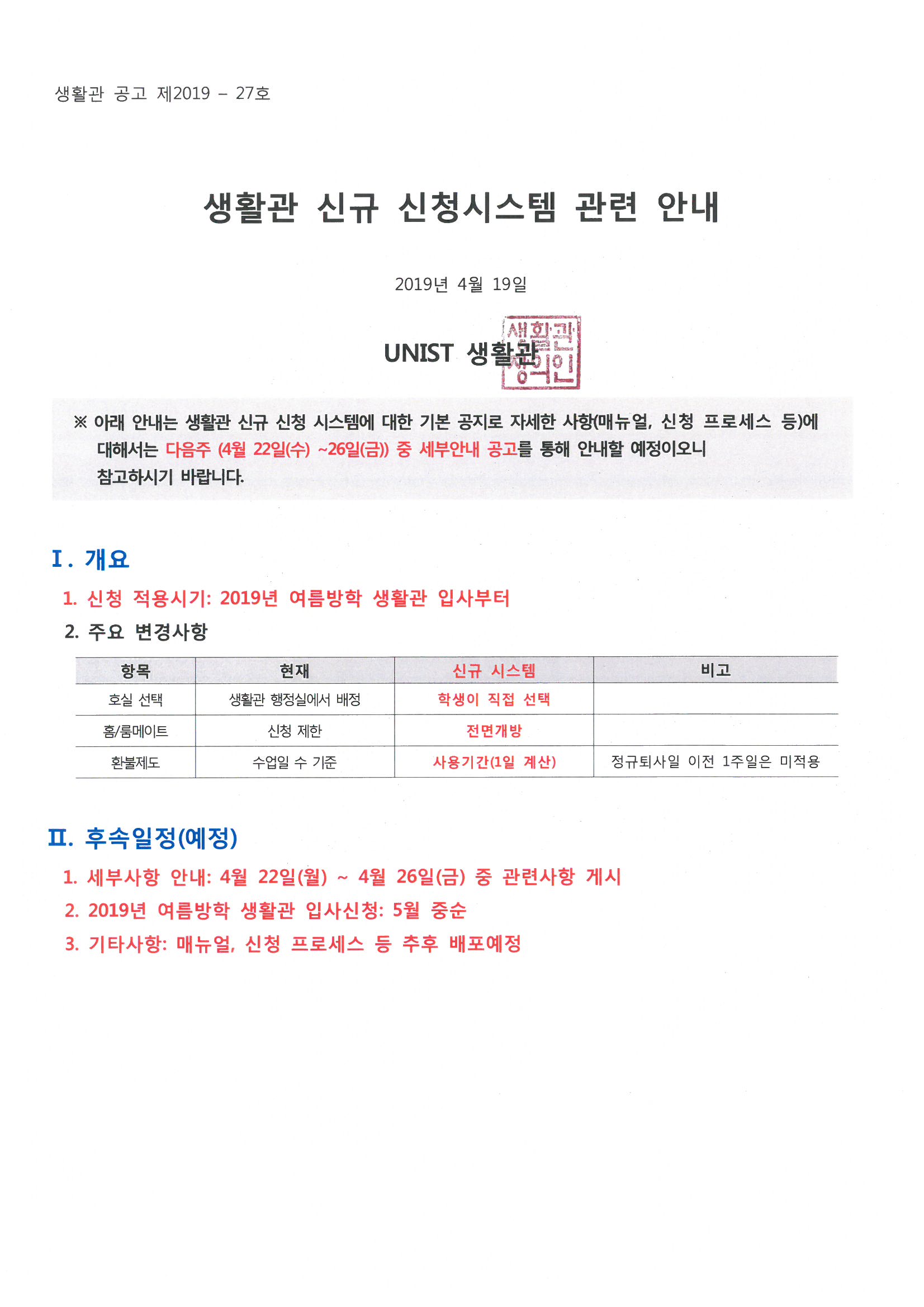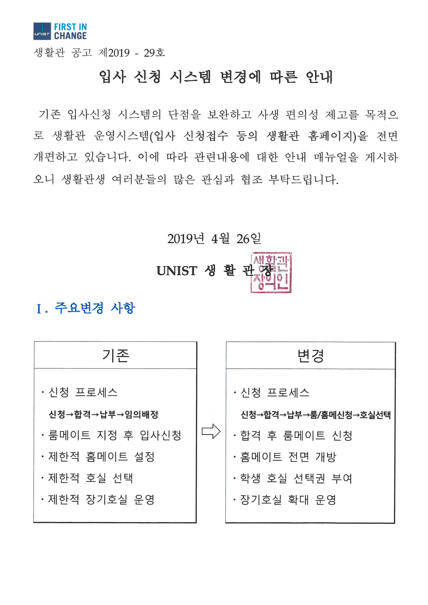 | 158 | (No.2019-27) 생활관 신규 신청시스템 관련 안내(Informatio.. | 2019-04-20 | 2077 |