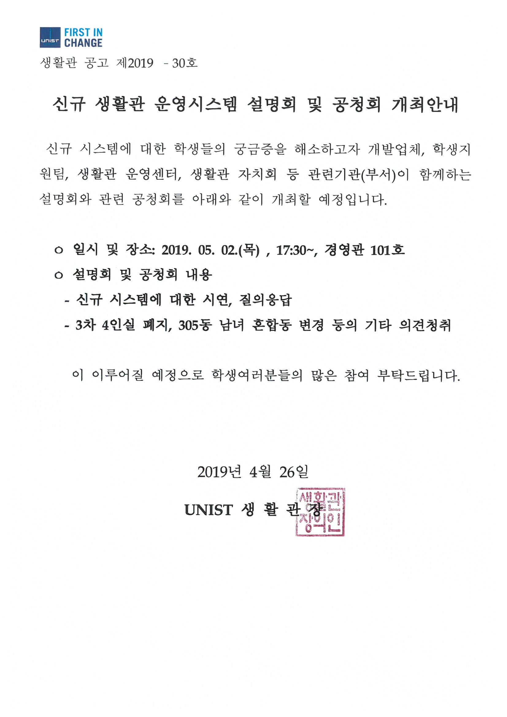 | 161 | (No.2019-30) 신규 생활관 운영시스템 설명회 및 공청회 개.. | 2019-04-27 | 1704 |