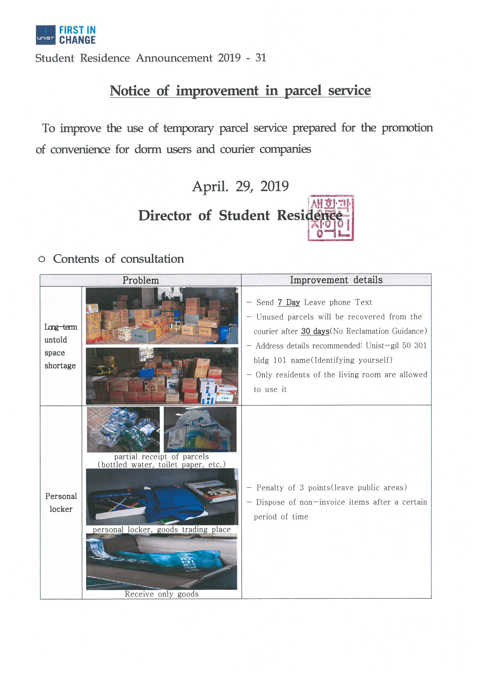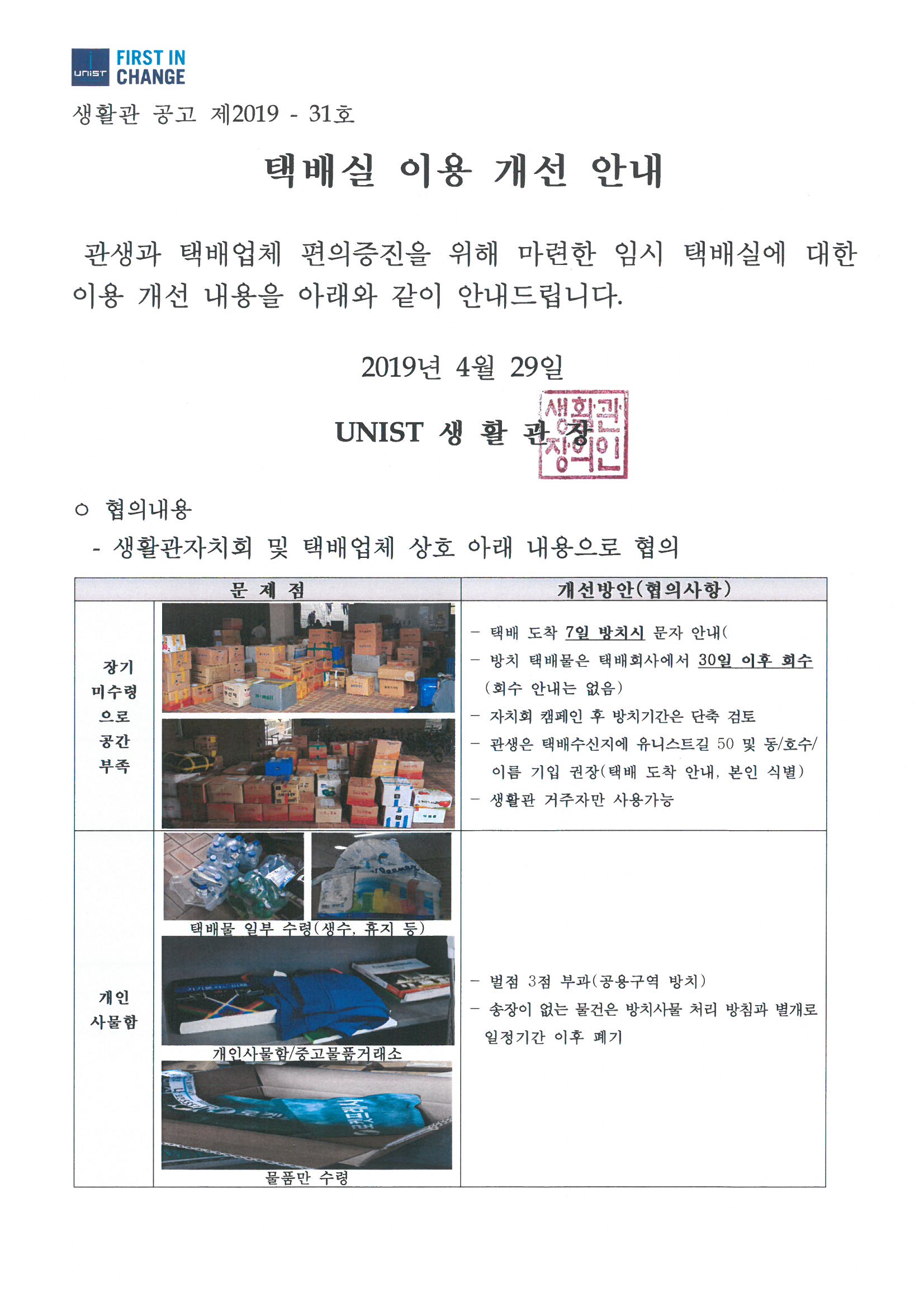 | 162 | (No.2019-31) 택배실 이용 개선 안내(Notice of improvement.. | 2019-04-30 | 2485 |