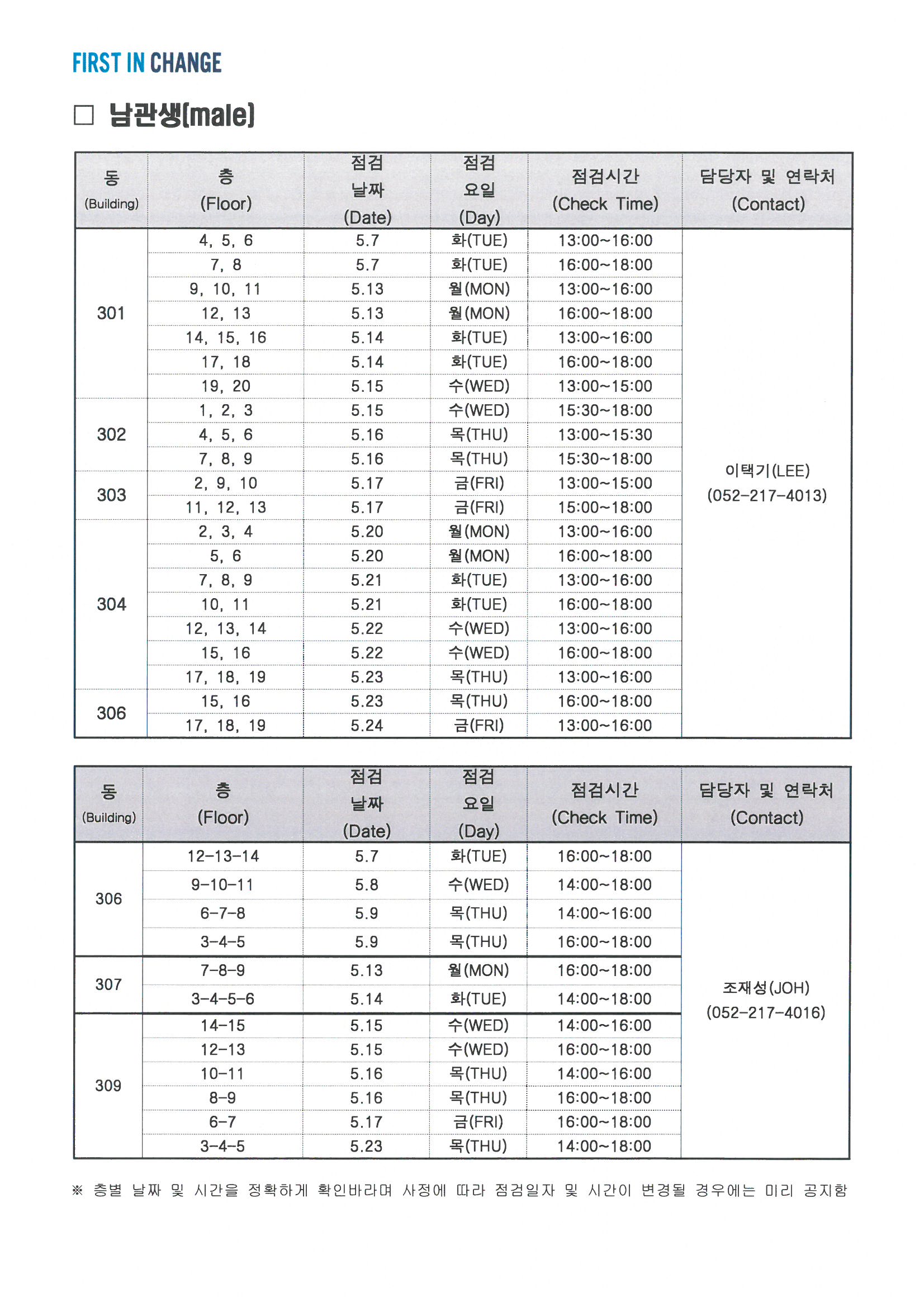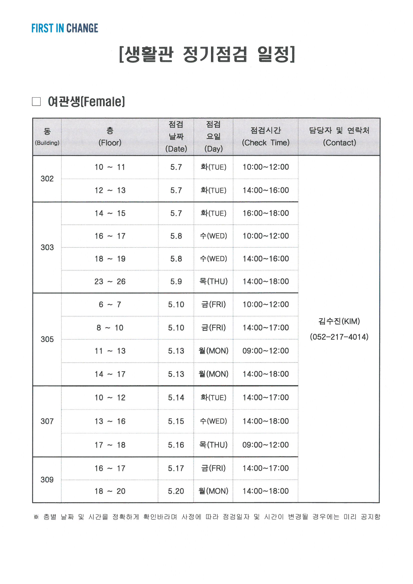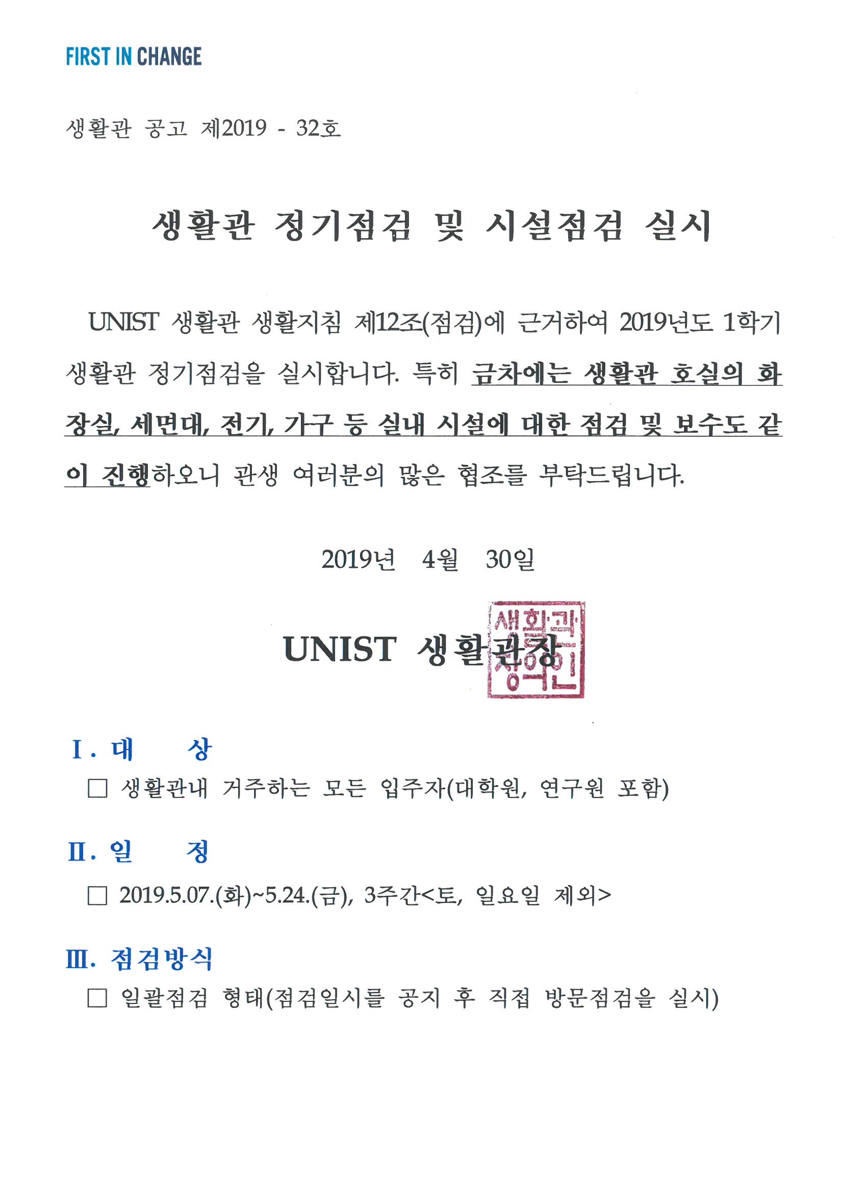 | 163 | (No.2019-32) 생활관 정기점검 및 시설점검 실시(Student Re.. | 2019-05-01 | 3545 |