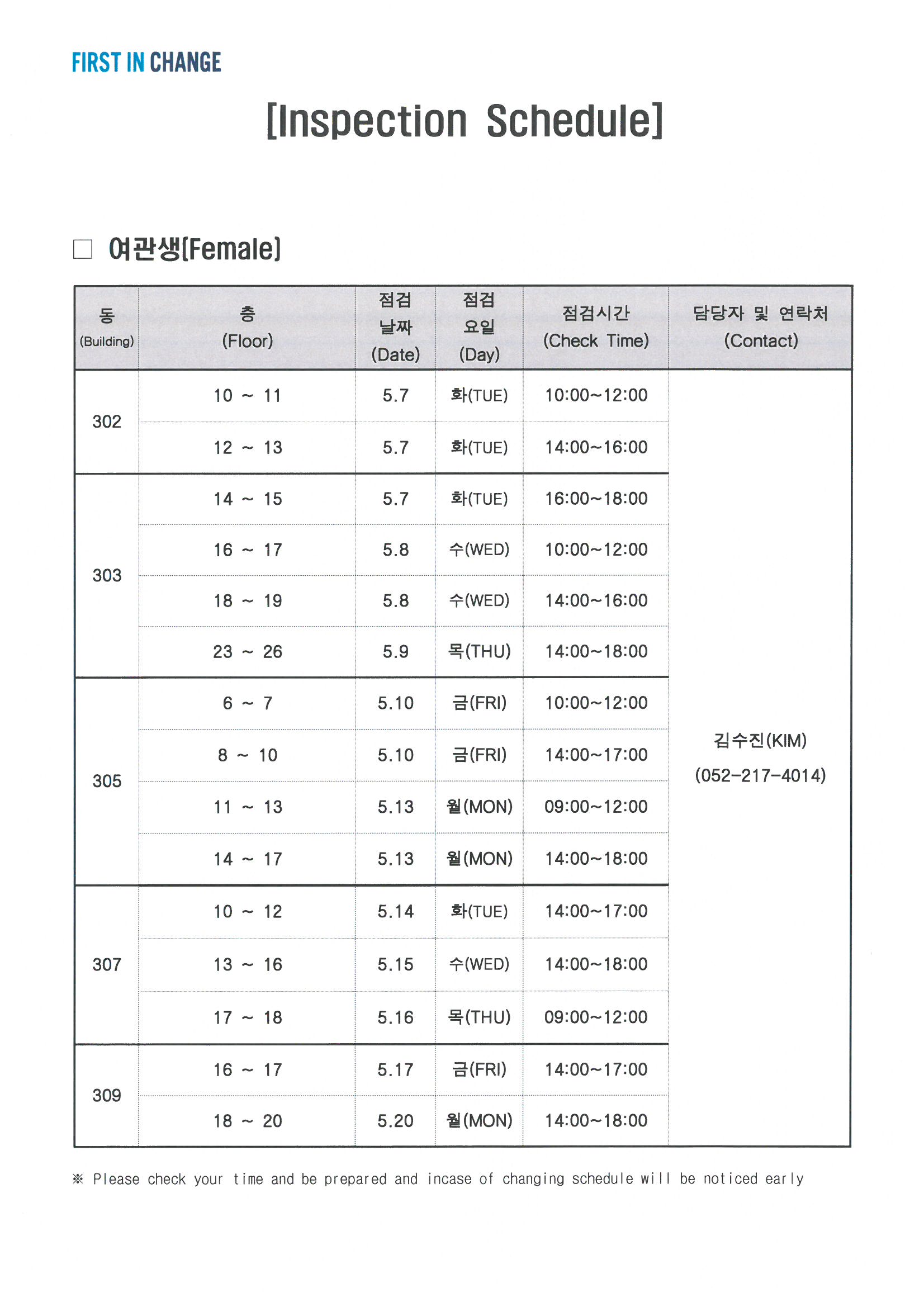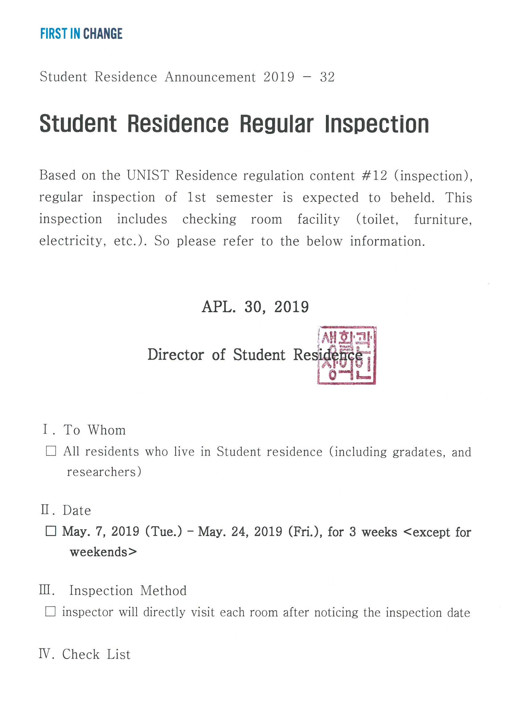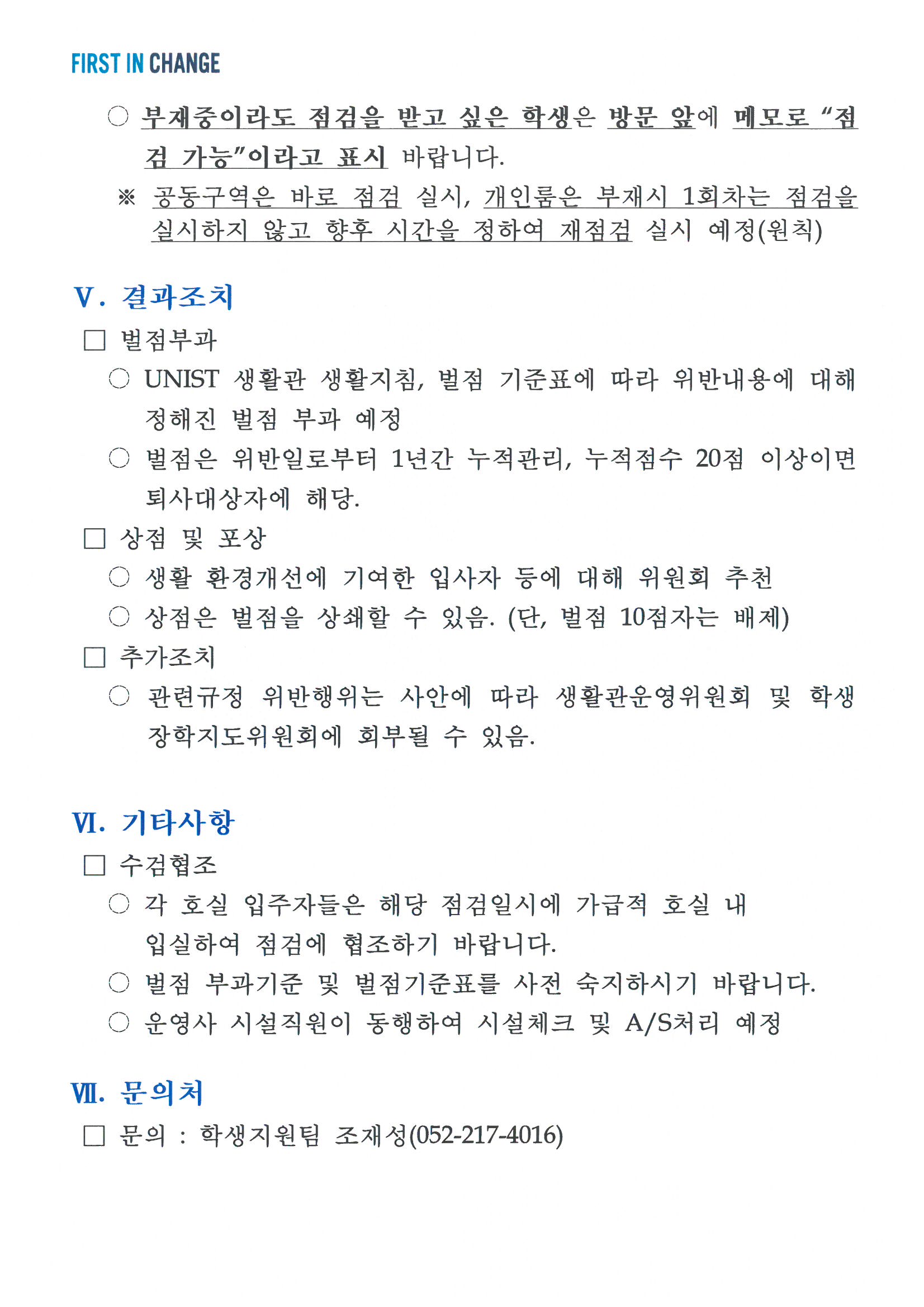 | 163 | (No.2019-32) 생활관 정기점검 및 시설점검 실시(Student Re.. | 2019-05-01 | 3545 |