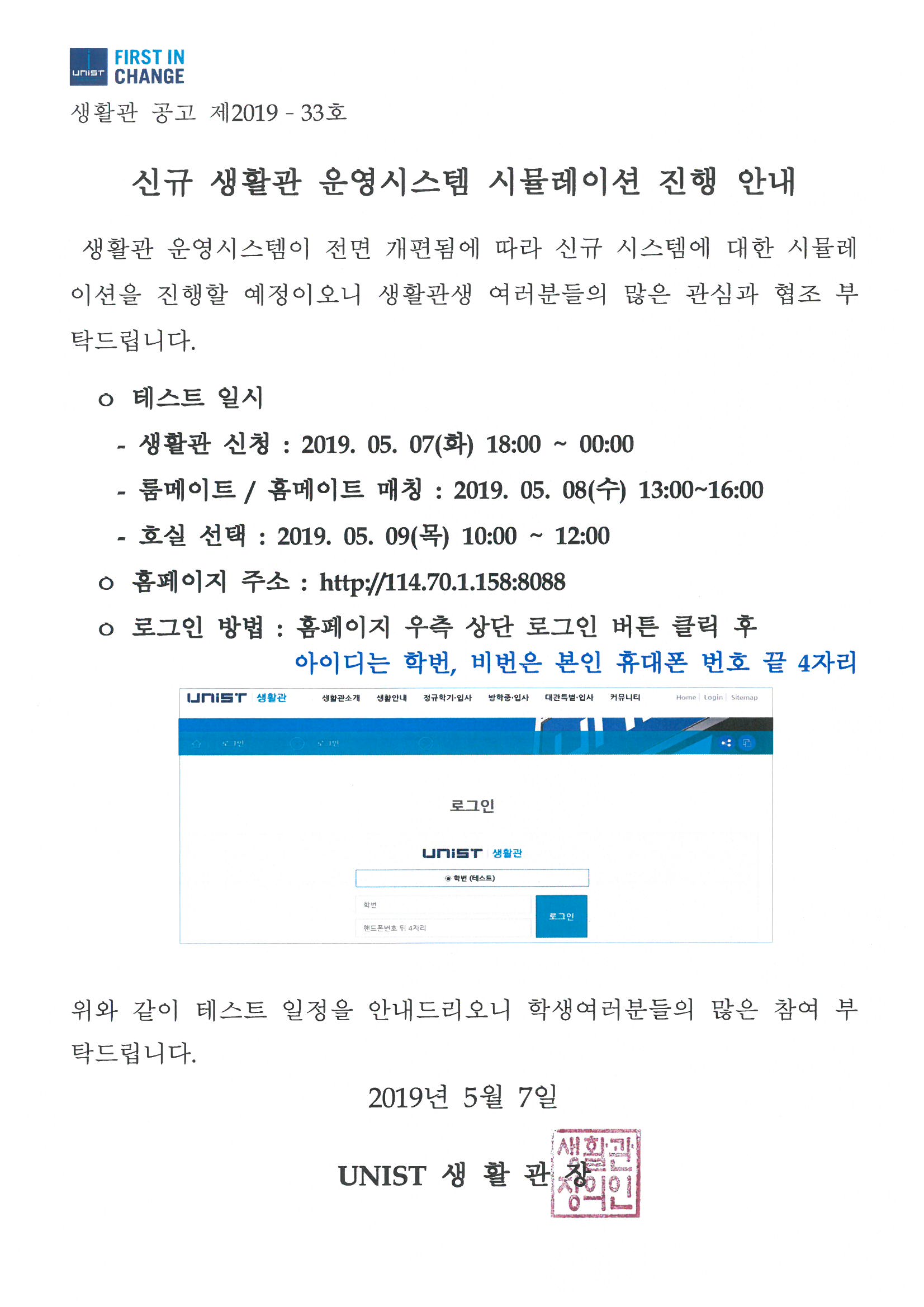 | 164 | (No.2019-33) 신규 생활관 운영시스템 시뮬레이션 진행 안내 | 2019-05-07 | 2369 |