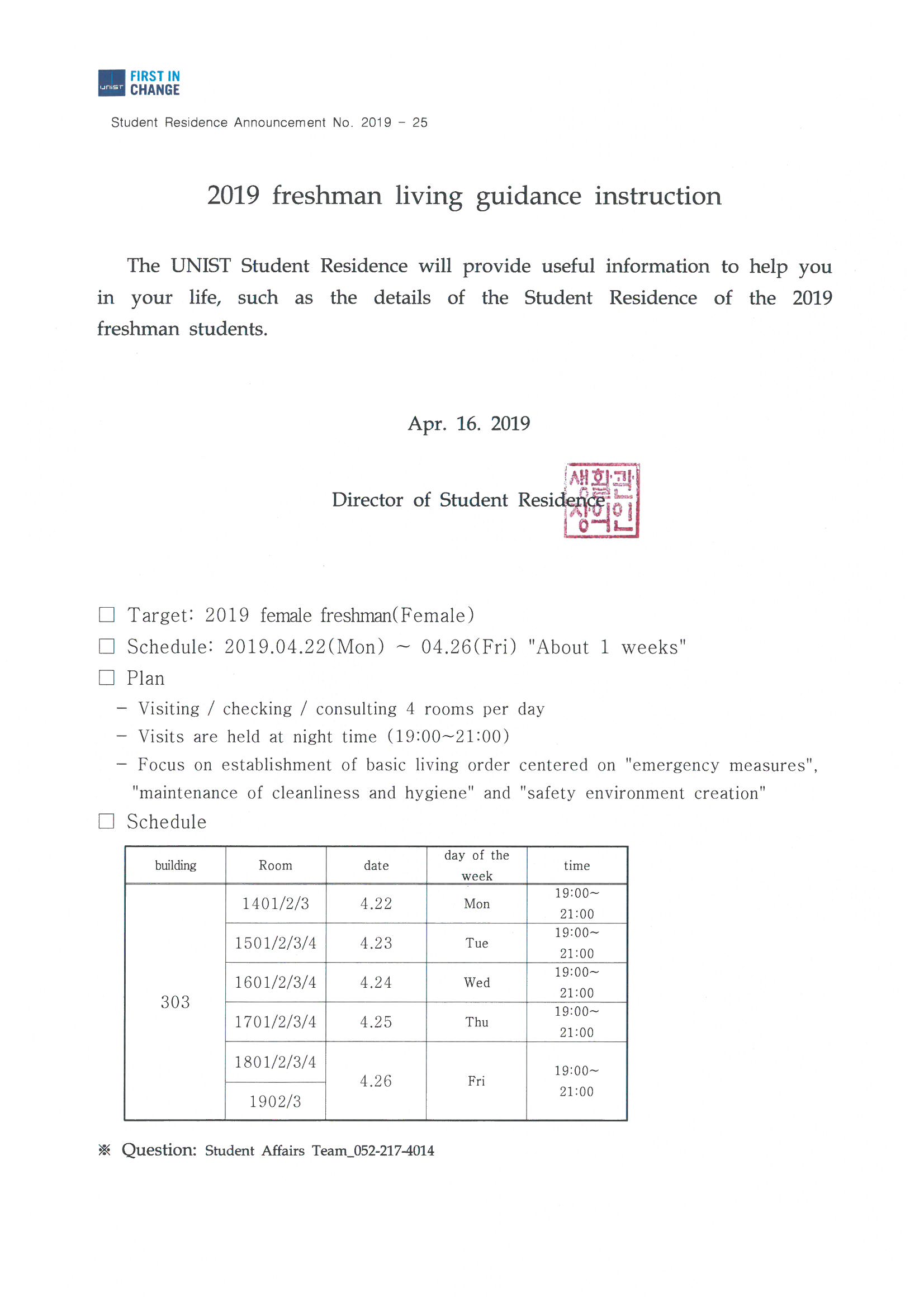 | 156 | (No.2019-25) 2019학년도 신입생 1학기 생활관 생활지도 시.. | 2019-04-17 | 1347 |