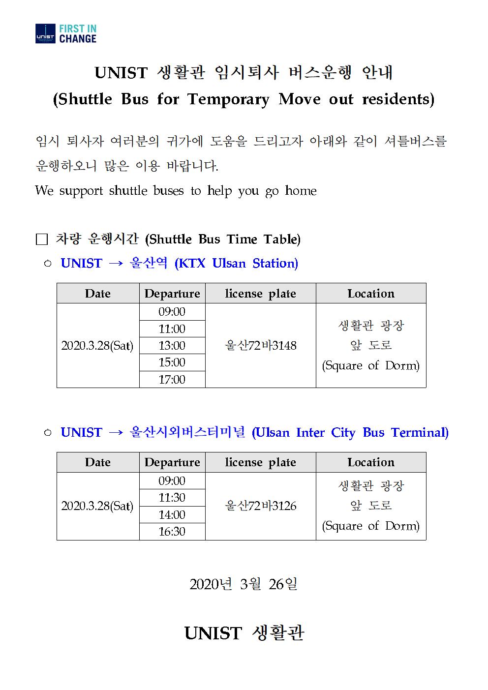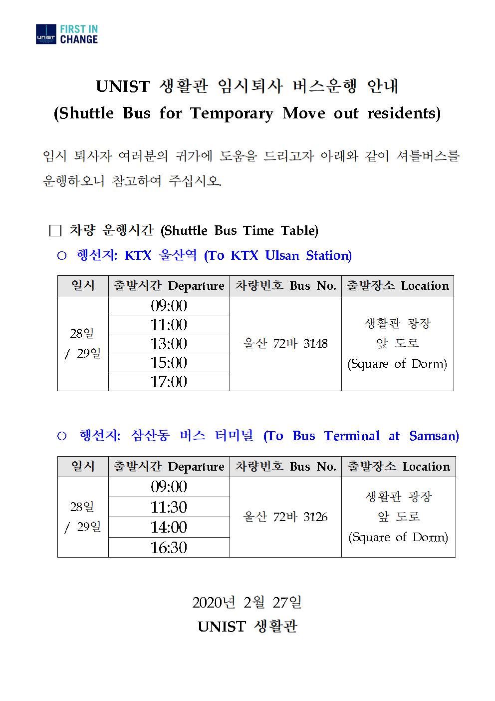 | 12 | UNIST 생활관 임시퇴사 버스운행 안내 (Shuttle Bus for Tem.. | 2020-03-27 | 484 |
