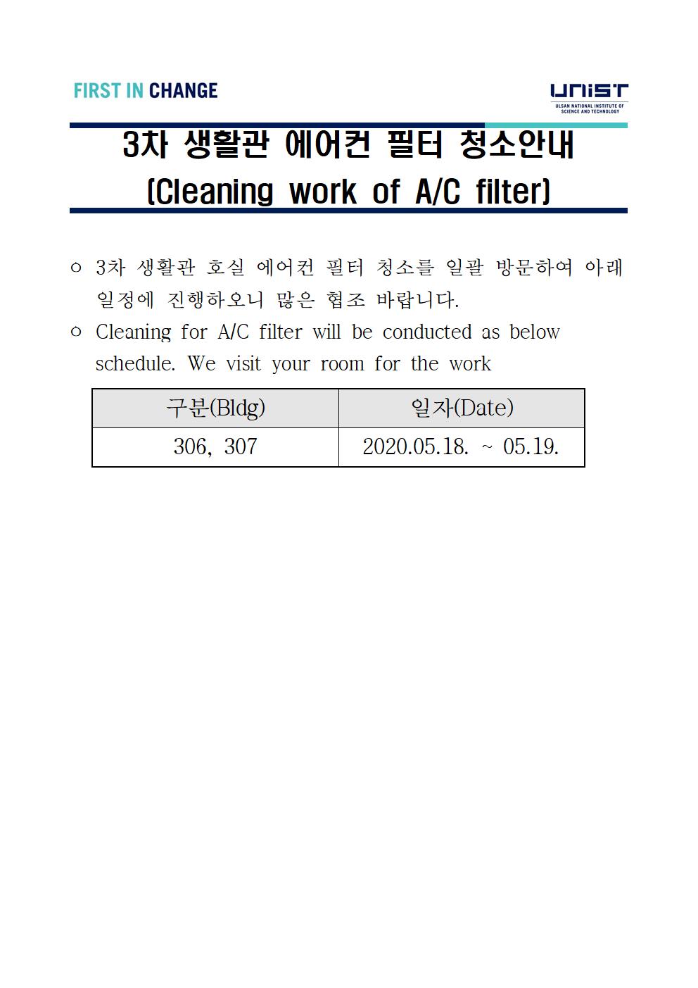 | 13 | 3차 생활관 에어컨 필터 청소안내(Cleaning work of A/C fil.. | 2020-05-12 | 622 |