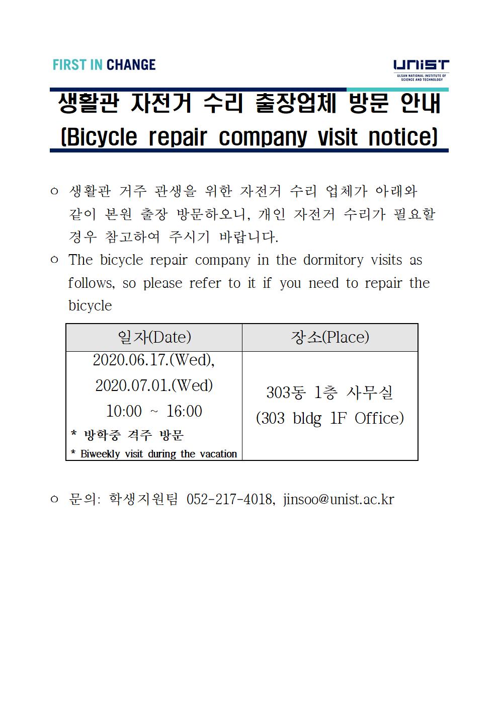 | 16 | 생활관 자전거 수리 출장업체 방문 안내(Bicycle repair com.. | 2020-06-16 | 451 |
