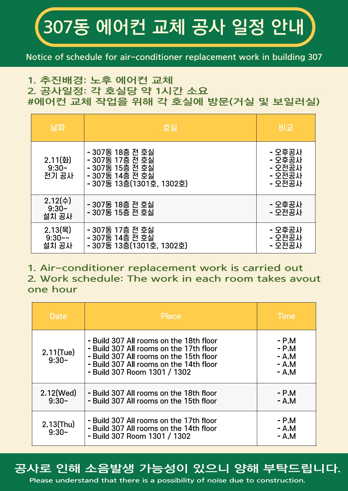 307동 에어컨 교체 공사 일정 안내/Notice of schedule for air-conditioner replacement work in building 307