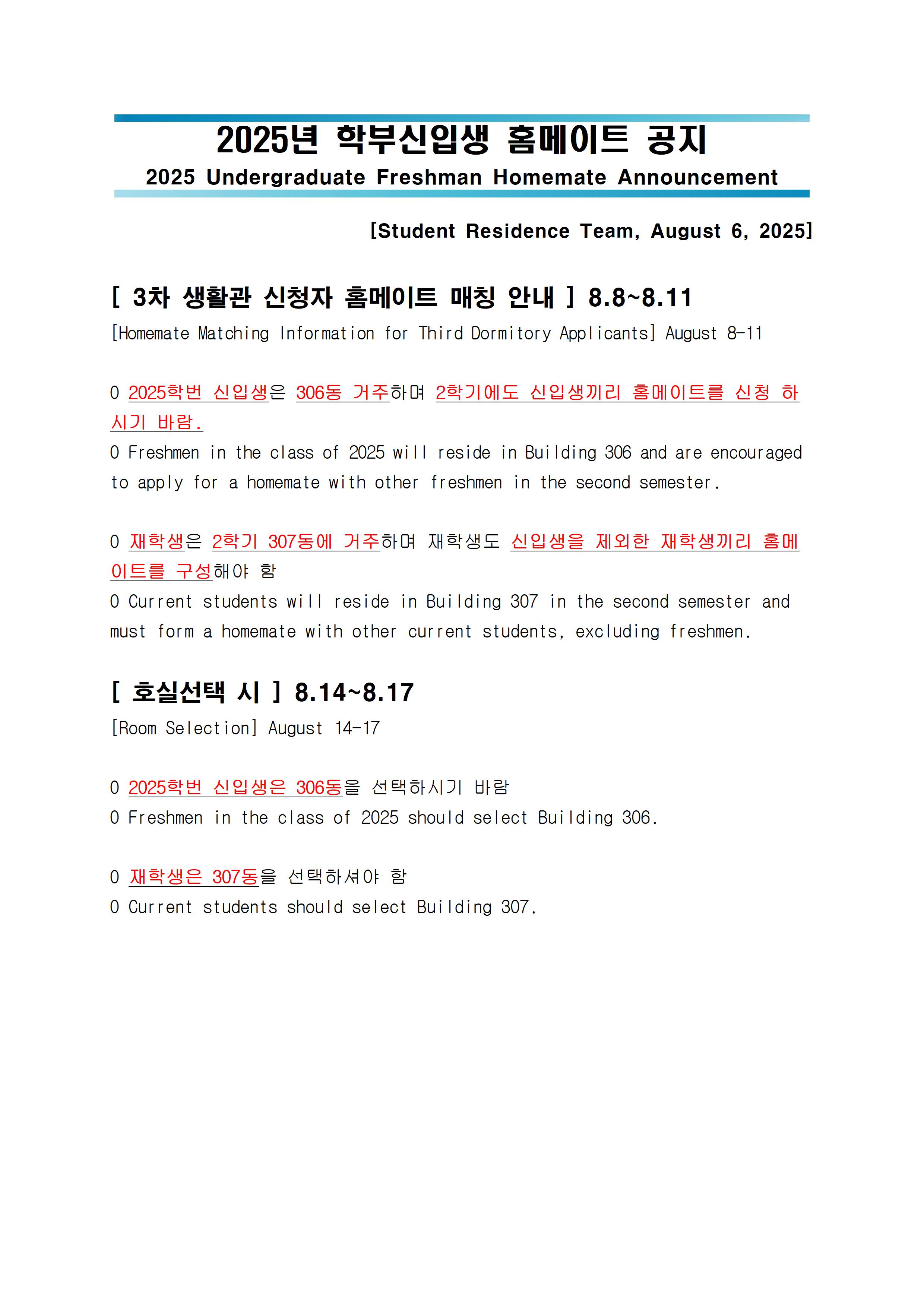 2025년 학부신입생 홈메이트 공지 2025 Undergraduate Freshman Homemate Announcement